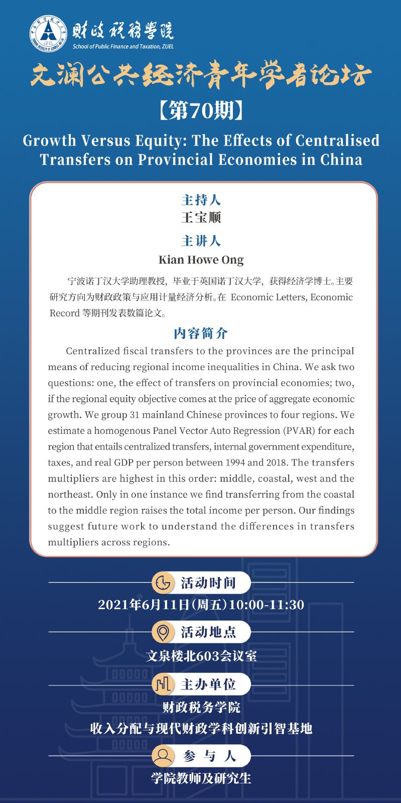 【讲座预告】文澜公共经济青年学者论坛(第70期)