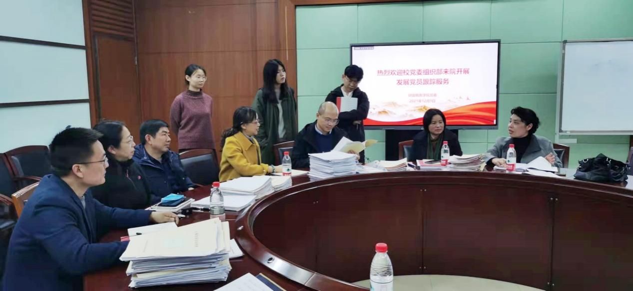 12月9日下午153:30,校党委组织部副部长陈金川、李明老师、公共管理学院组织员王智、工商管理学院组织员刘淑君老师一行莅临我院开展发展党员跟踪服务工作。我院党委书记袁桂君、副书记笪宁,组织员丁奕、研究生辅导员程明梅、本科生党支部书记邹炘良及研究生党支部书记刘紫斌、博士党支部书记马婷钰参加了本次座谈会。