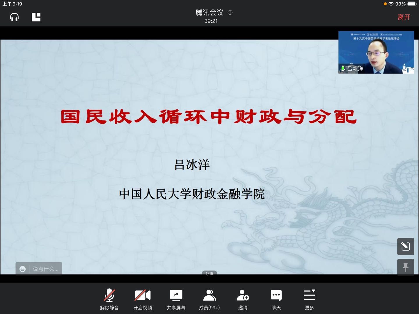 开幕式之后进入主旨发言环节,中国人民大学财政金融学院的吕冰洋教授和复旦大学经济学院的封进教授分别做主旨发言。