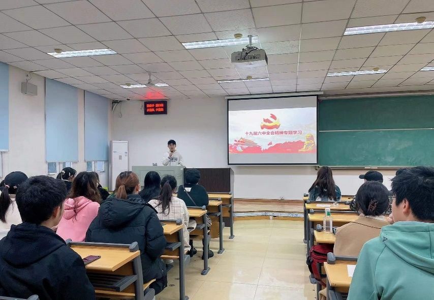 为深入学习贯彻党的十九届六中全会精神,深刻认识党的百年奋斗成就,加强学生干部思想政治建设,12月23日下午,财政税务学院2021级全体班委于文润303教室进行十九届六中全会精神学习。本次学习会议邀请到财政税务学院学术硕士第一党支部书记刘紫斌为21级班委进行授课。