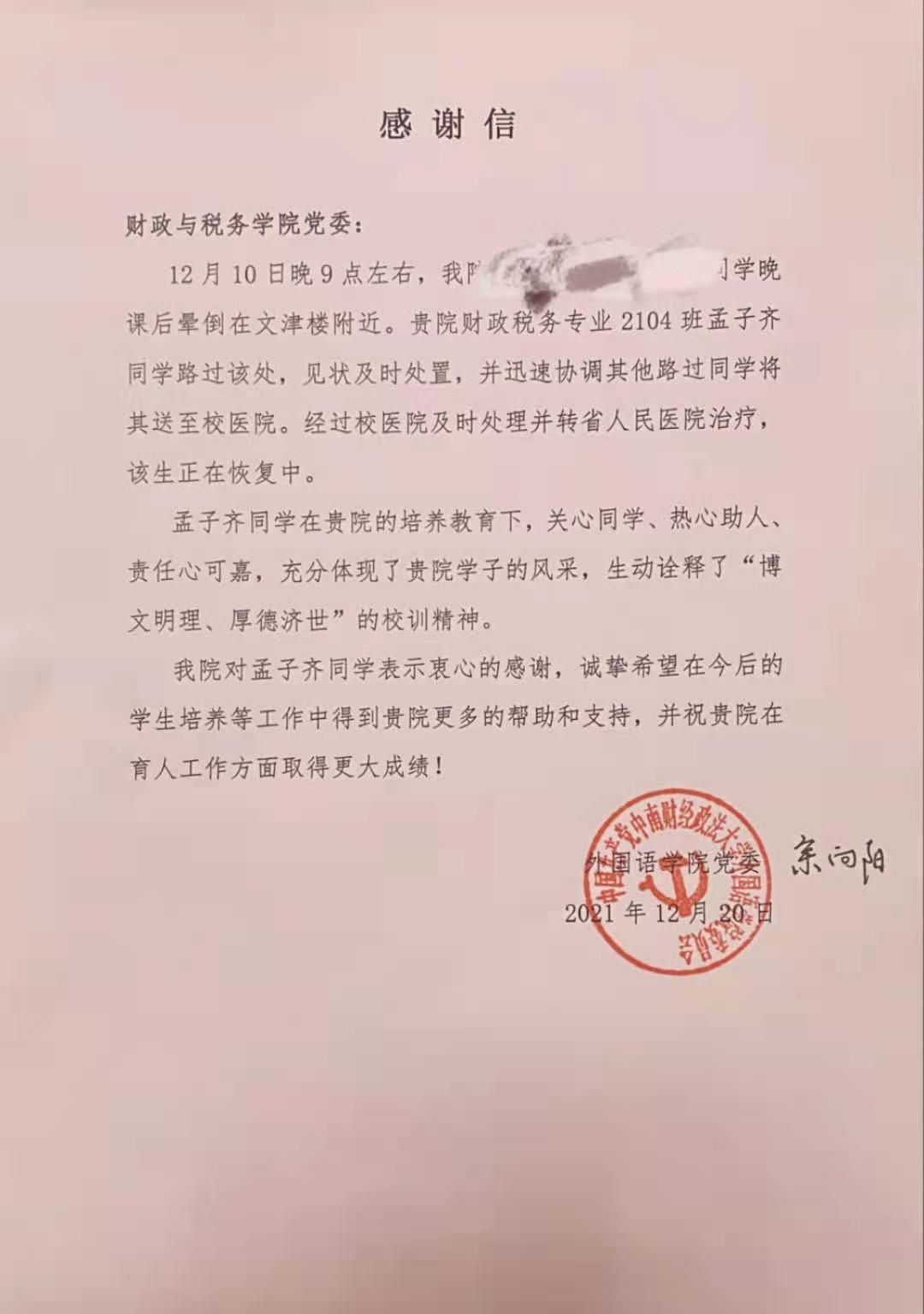 12月23日上午,外国语学院党委了解此事后,专门委派余向阳副书记携带感谢信到我院进行感谢,对我院“三全育人”成效予以了充分肯定。余向阳副书记表示,孟子齐同学在看到同学晕倒路旁时,积极、主动地伸出援手,进行帮助和救护,充分体现财税学子关心同学、乐于助人的风采,生动诠释了中南大学子“博文明理、厚德济世”的校训精神。
