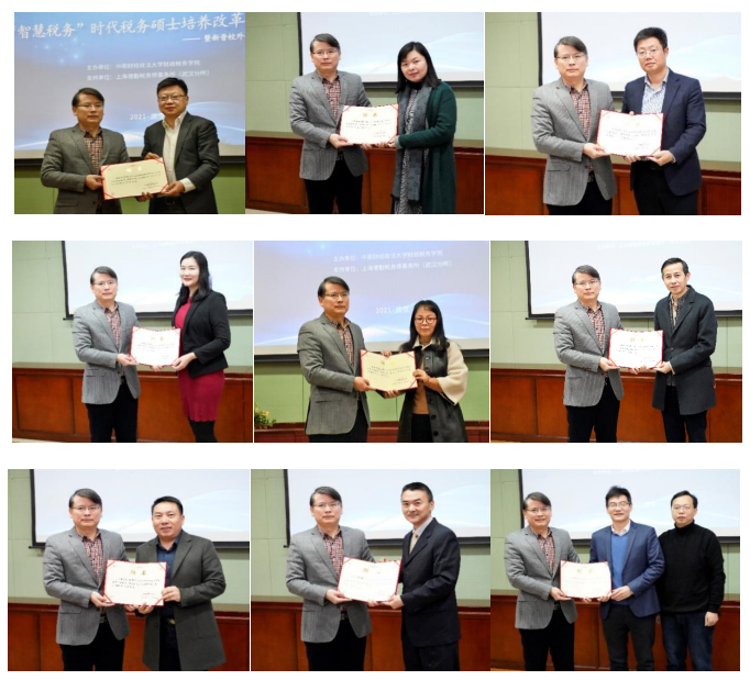 会议第三项,举行税务专业硕士校外导师聘任仪式。张克中院长分别向新晋校外导师范宏彬先生、刘玲女士、邓兵先生、屈郡女士、刘小娟女士、易坤山先生、阮志勇先生、李强先生、陈刚先生颁发聘书,并合影留念。