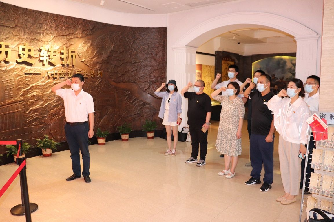 在八七会议会址纪念馆的一楼大厅,党员同志们整齐队伍,奏唱国歌。面向党旗,吴兴华同志带领全体党员重温入党誓词。袁媛同志诵读《中国共产党章程》节选,全体党员现场交纳党费。