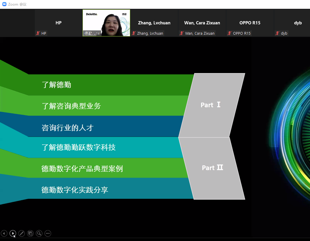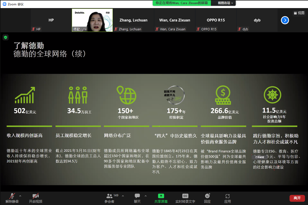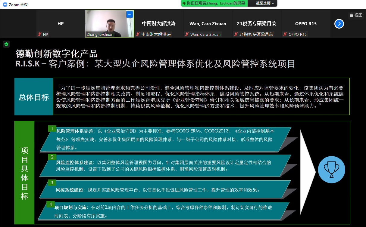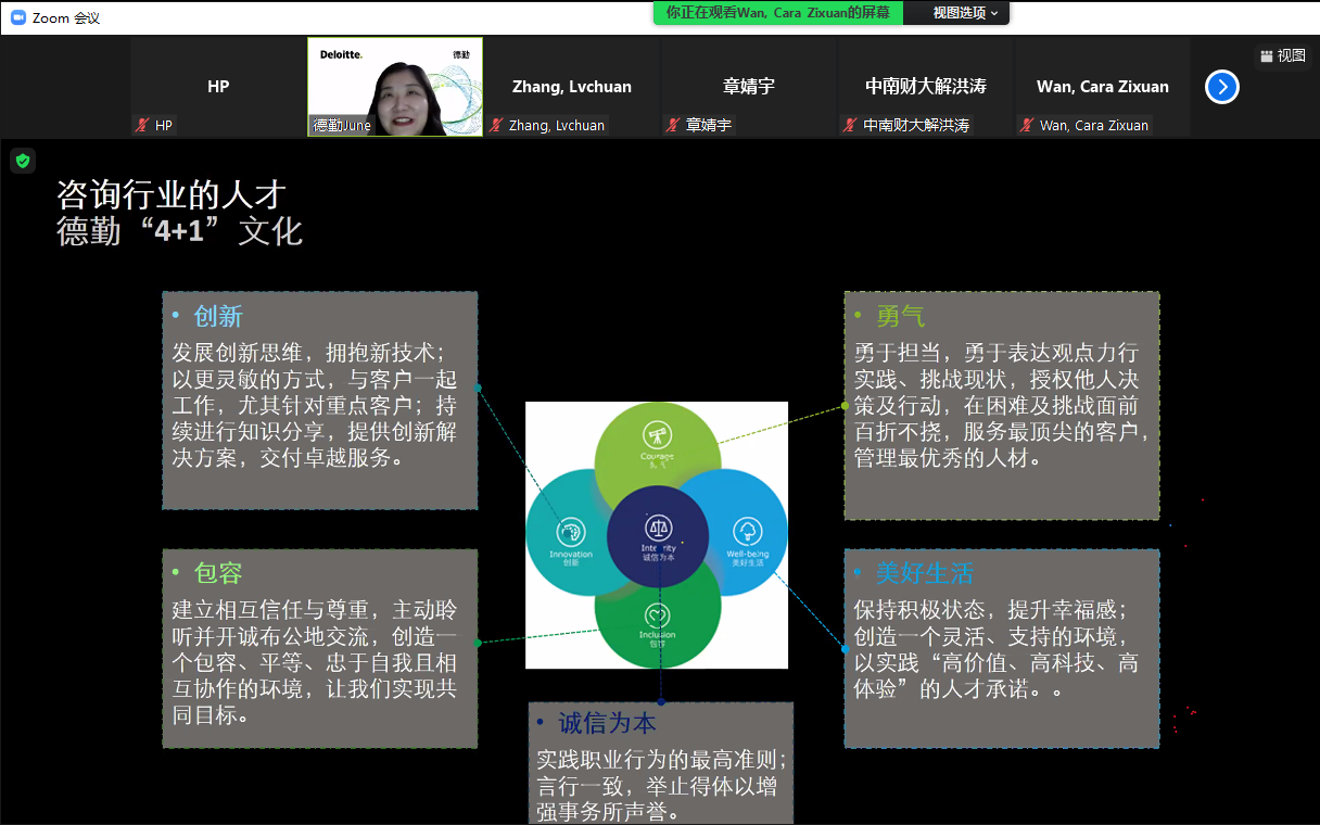 屈郡总监从了解德勤、咨询业务、目标人才等三个方面进行了介绍,并以典型案例讲述了咨询行业的工作内容、问题要点、目标人群和业务范围,阐述了高素质人才对德勤咨询业务发展的重要性,并表示持续学习、扎实功底、务实态度对咨询行业的重要性,分享了将财务与税务结合、将财务与业务结合的重要思路。