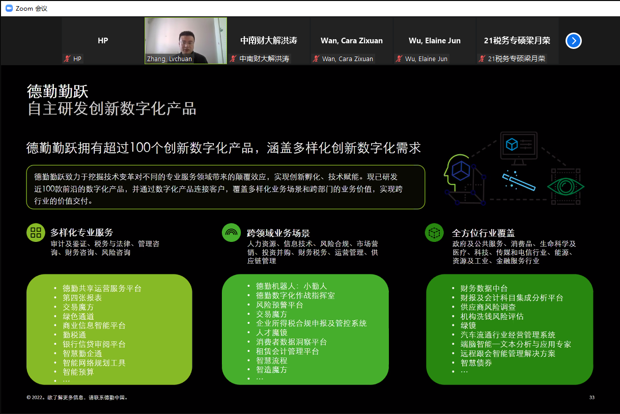 6月29日上午9点,财政税务学院德勤咨询及数字化主题讲座第一期以线上会议形式举办。受学院邀请,德勤中国税务及商务咨询总监屈郡、德勤中国勤跃数字化研发中心高级经理张吕川,结合咨询行业及其数字化融合场景的发展前沿作了精彩分享,讲座由学院税务专硕中心主任解洪涛教授主持。