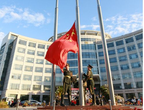 上午7:03,升旗仪式正式开始。国旗护卫队队员迈着整齐划一的雄健步伐护送五星红旗进场,鲜红的国旗伴随着嘹亮的歌声冉冉升起。随后,党委书记袁桂君带领大家重温入党誓词,在党旗下坚定了“为共产主义奋斗终身”的崇高誓言。