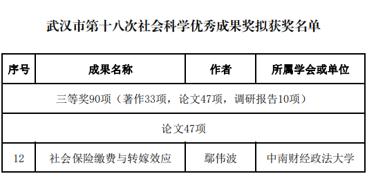 10月27日,武汉市社会科学奖励工作办公室公示了“武汉市十八次社会科学优秀成果奖拟获奖名单”。我院鄢伟波老师在国内顶尖期刊《经济研究》上发表的成果“社会保险缴费与转嫁效应”拟获三等奖。