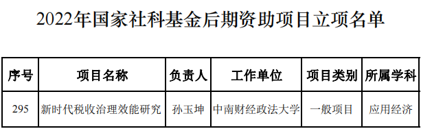 11月29日下午,全国哲学社会科学工作办公室官网发布了《2022年度国家社科基金后期资助暨优秀博士论文出版项目立项名单公示》,我院孙玉坤老师研究的课题“新时代税收治理效能研究”获得一般项目立项。