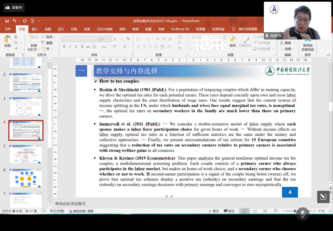 最后,主持人解洪涛教授对两位主讲老师的发言进行简单总结,随后与会的各位导师和同学积极进行了交流与讨论。解洪涛教授表示,本次研讨会有利于明确税务专硕课程改进的方向,有利于促进教学相长。至此,财政税务学院教学第10期研讨会圆满结束。(通讯员:李佩 唐灿灿)