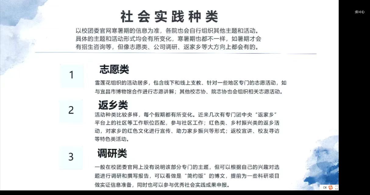 会议伊始,邱盎然进行经验分享。她首先将社会实践分为了志愿类、返乡类、调研类以及实习类四大类,从自己的经历出发为我们进行介绍。她还指出,社会实践需要眼光、恒信、热情、合作等个人素养。最后,邱盎然提出“大学生需要社会实践,社会实践也需要大学生。大学生进行社会实践将有利于其了解社会、知识转化、增长能力以及自我施压,实现个人的成长。”