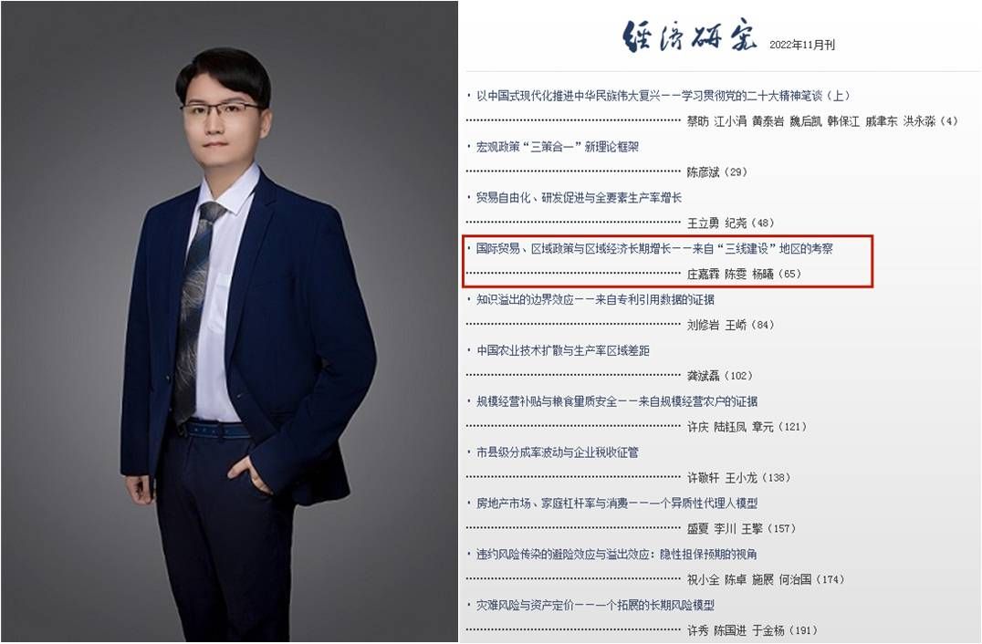 近日,我院庄嘉霖老师及其合作者的研究成果“国际贸易、区域政策与区域经济长期增长——来自‘三线建设’地区的考察”在顶级期刊《经济研究》2022年第11期正式发表。