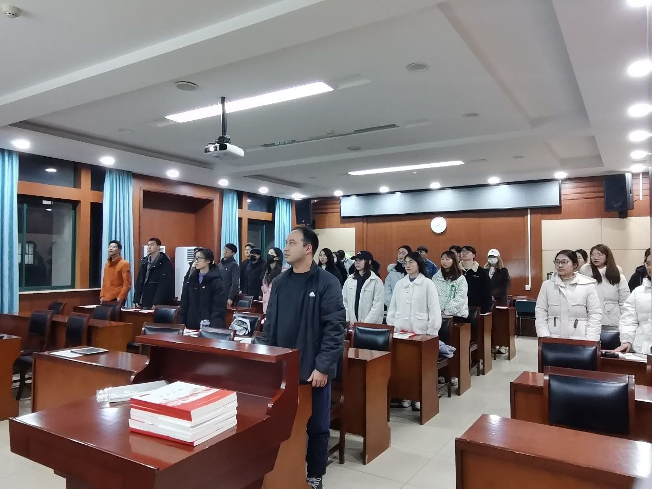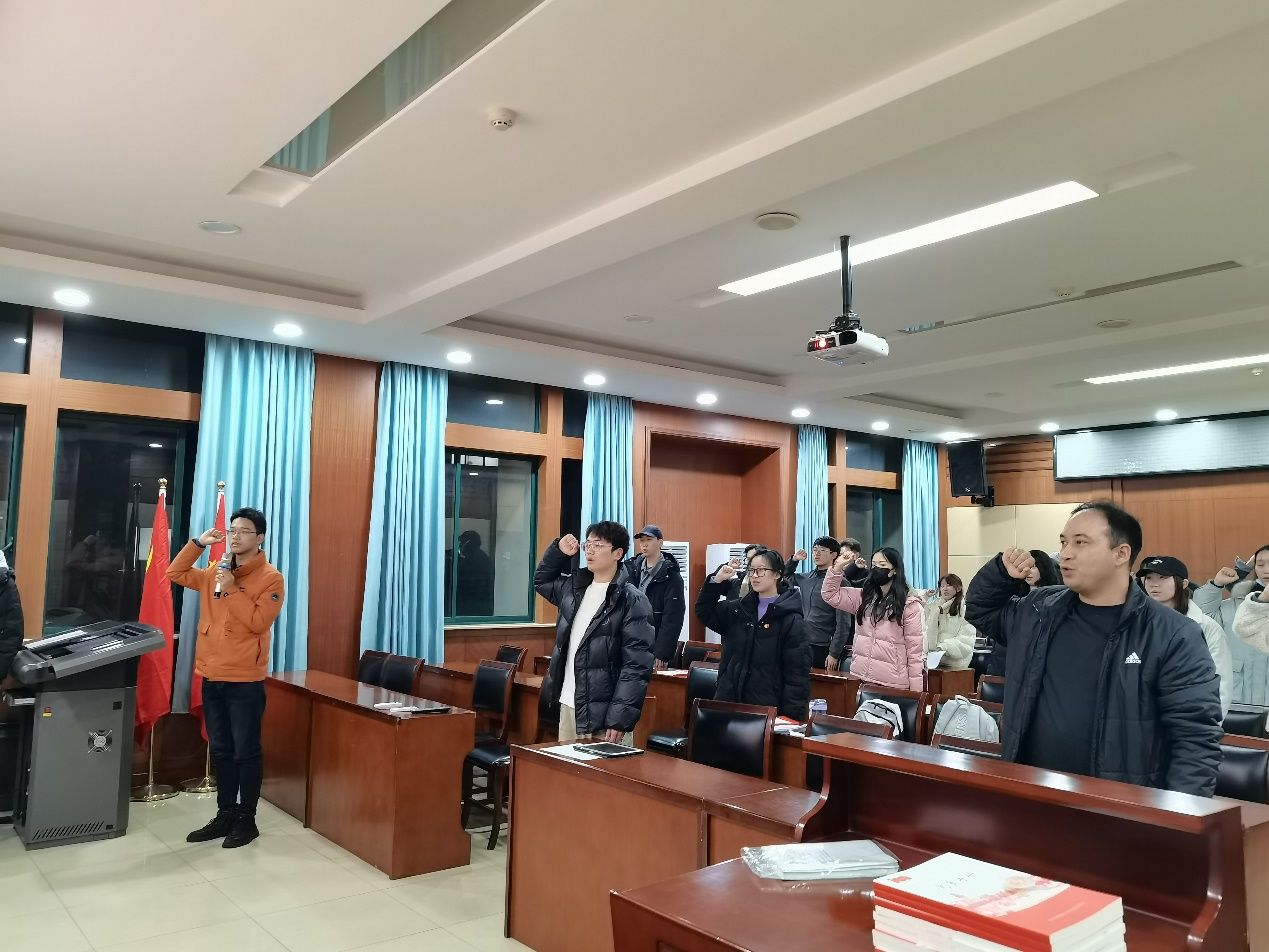 会议第二项,支部成员全体起立,面向党旗举起右拳,在卜瑞奇同志的带领下重温入党誓词。
