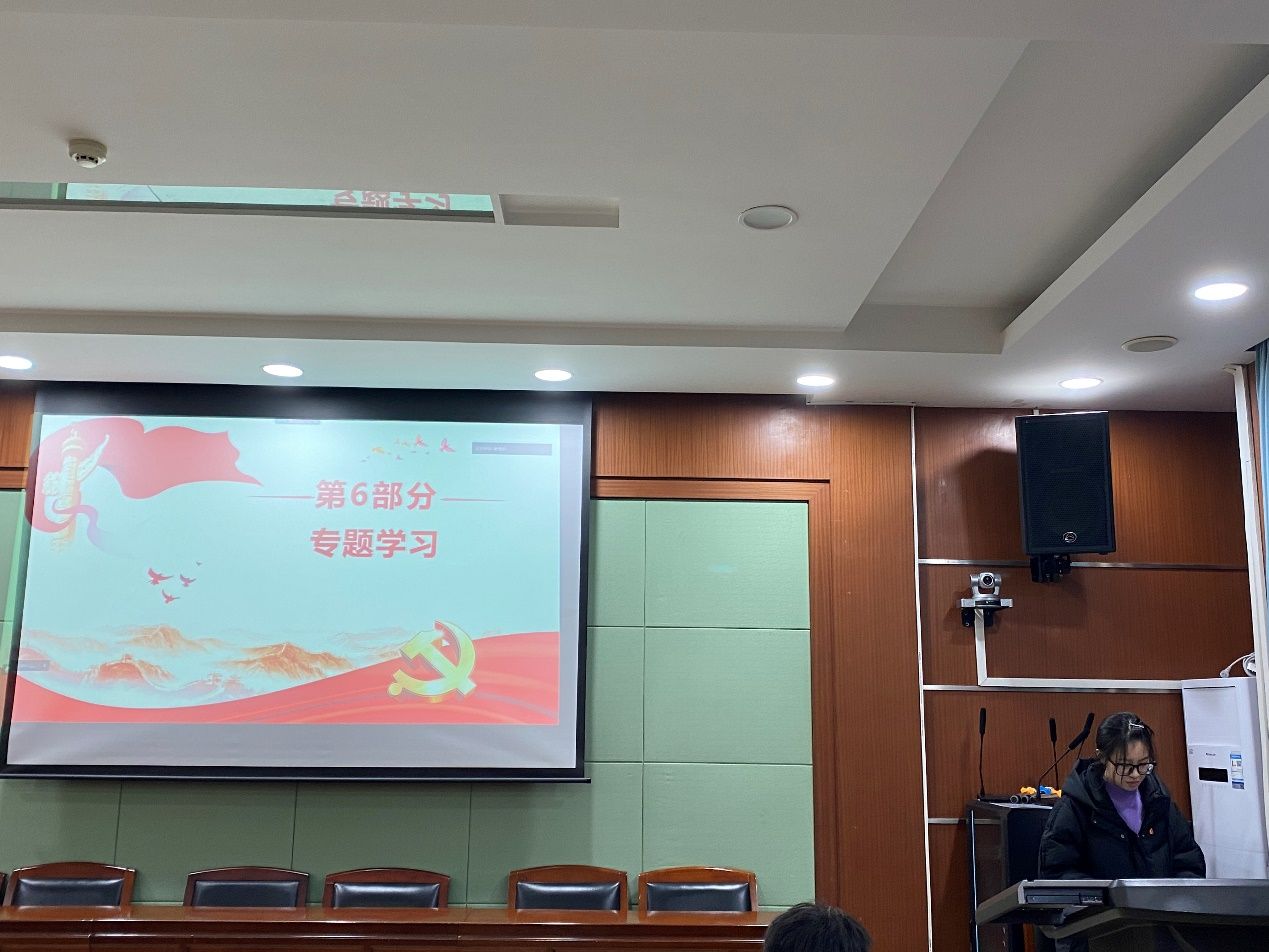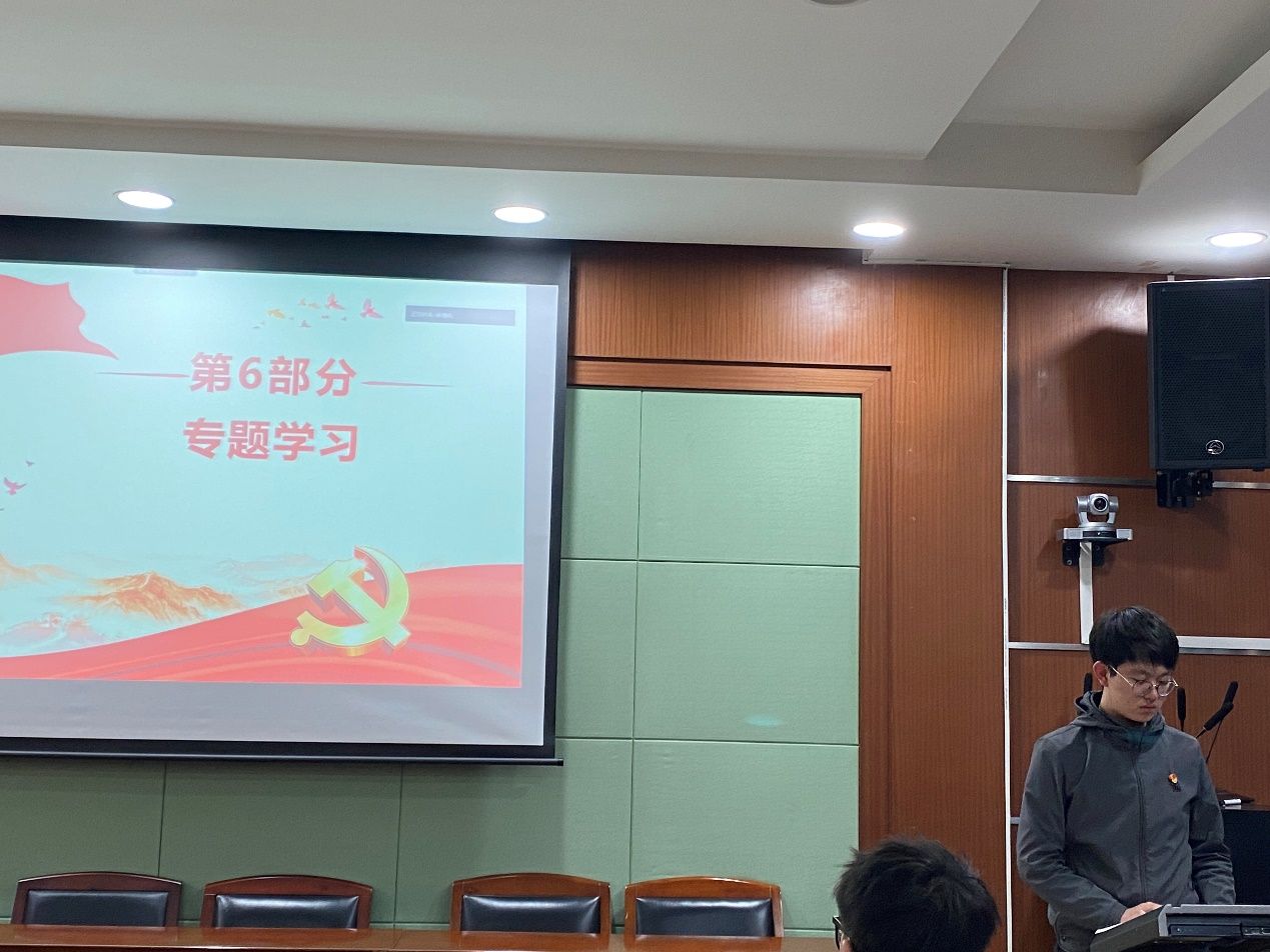 会议第五项,专题学习环节。由谢滢成同志带领支部成员深入学习宣传贯彻党的二十大精神、深入学习中央重要工作会议精神。2023年是全面贯彻落实党的二十大精神的开局之年,全面贯彻党的二十大精神,为实现党的二十大确定的目标任务而团结奋斗,是我们新一年的重大政治任务。通过组织开展专题学习,带领大家持续、全面、系统、深入学习贯彻党的二十大精神,用习近平新时代中国特色社会主义思想武装头脑,加强学习力度,为全面建设社会主义现代化国家,全面推进中华民族伟大复兴而团结奋斗。会议号召,全党要紧密团结在以习近平同志为核心的党中央周围,增强“四个意识”,坚定“四个自信”,做到“两个维护”,勠力同心、勇毅前行,努力完成经济社会发展目标任务,为全面建设社会主义现代化国家、全面推进中华民族伟大复兴作出新贡献。