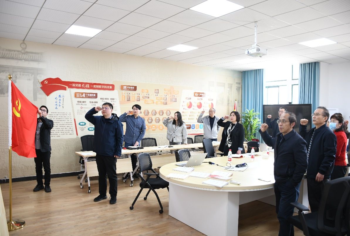 活动伊始,全体起立奏唱国歌,面向党旗重温入党誓词,并现场交纳党费。支委亓寿伟同志诵读《中国共产党章程》第六章“党的干部”,强调要严格按照党章要求,信念坚定,为民服务,勤政务实,敢于担当,清正廉洁,模范地履行好党员职责,充分发挥学科优势,努力为全面建设社会主义现代化国家贡献智慧和力量。支委王银梅同志重点领学了《中国共产党第二十届中央委员会第二次全体会议公报》《习近平:在第十四届全国人民代表大会第一次会议上的讲话》《2023 年政府工作报告》。祁毓同志布置了“关于开展借培训之名组织公款旅游问题自查自纠”“党建检查工作整改”等相关工作。