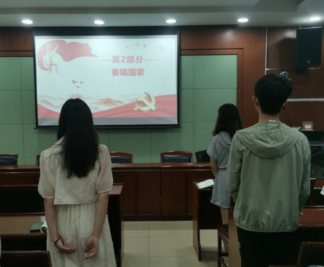 会议第二项,支部全体成员起立,面向党旗举起右拳,在丁世昱同志带领下重温入党誓词。