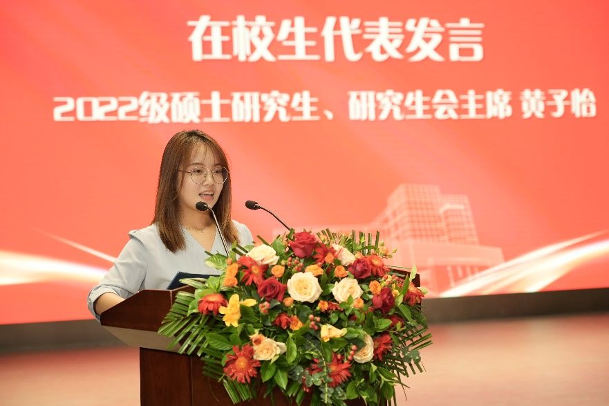 接着,在校生代表、研究生会主席黄子怡同学发言。她结合自身学习经历提出经验:要坚守初心,不懈奋斗;要有国际视野,家国情怀;要尊师爱友,敬业乐学;要内强素质,外塑体魄。