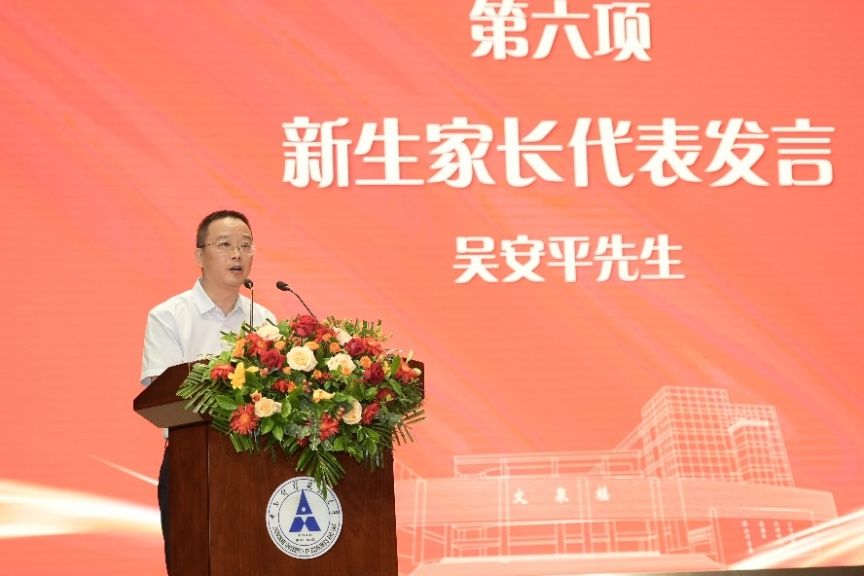 之后,吴安平先生作为新生家长代表发言。吴先生向新生们表达了家长们共同的希望:希望新生们永远保持着爱心、上进心与报国心。