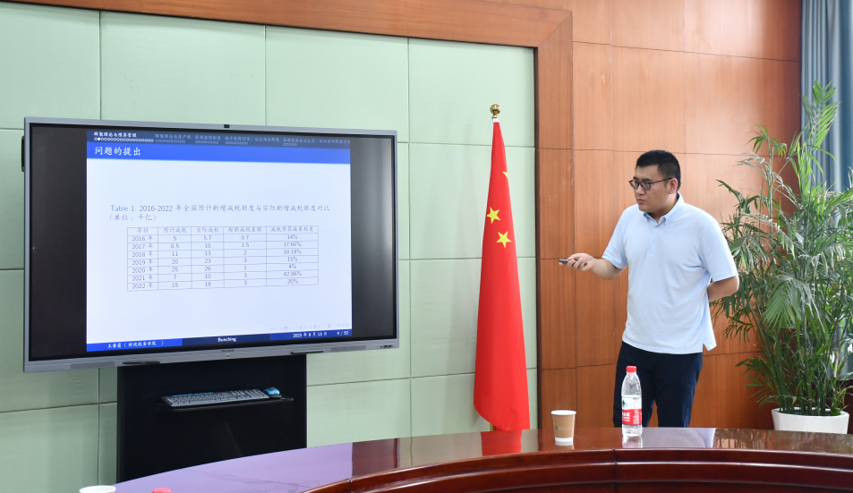 首先,王睿霆老师详细阐述了本文的研究背景和理论知识。其一,介绍了群聚行为的理论模型。其二,讲解了群聚理论在预算领域的应用,指出大规模减税降费政策推行以来,预算的减税额度与实际的减税额度差值较大,群聚理论解释了门槛性减税政策引发企业发生动态群聚响应所导致的预算偏差。