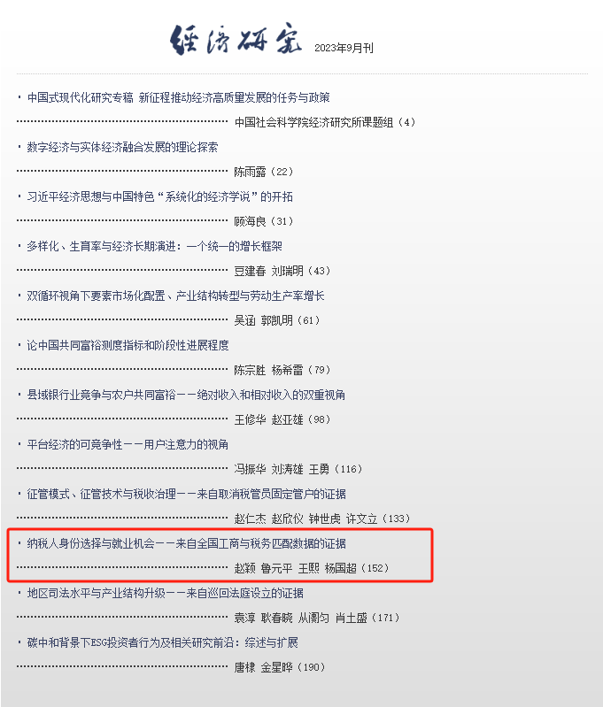 近日,我院赵颖、鲁元平两位教师及其合作者的研究成果“纳税人身份选择与就业机会——来自全国工商与税务匹配数据的证据”在顶级期刊《经济研究》2023年第9期正式发表。