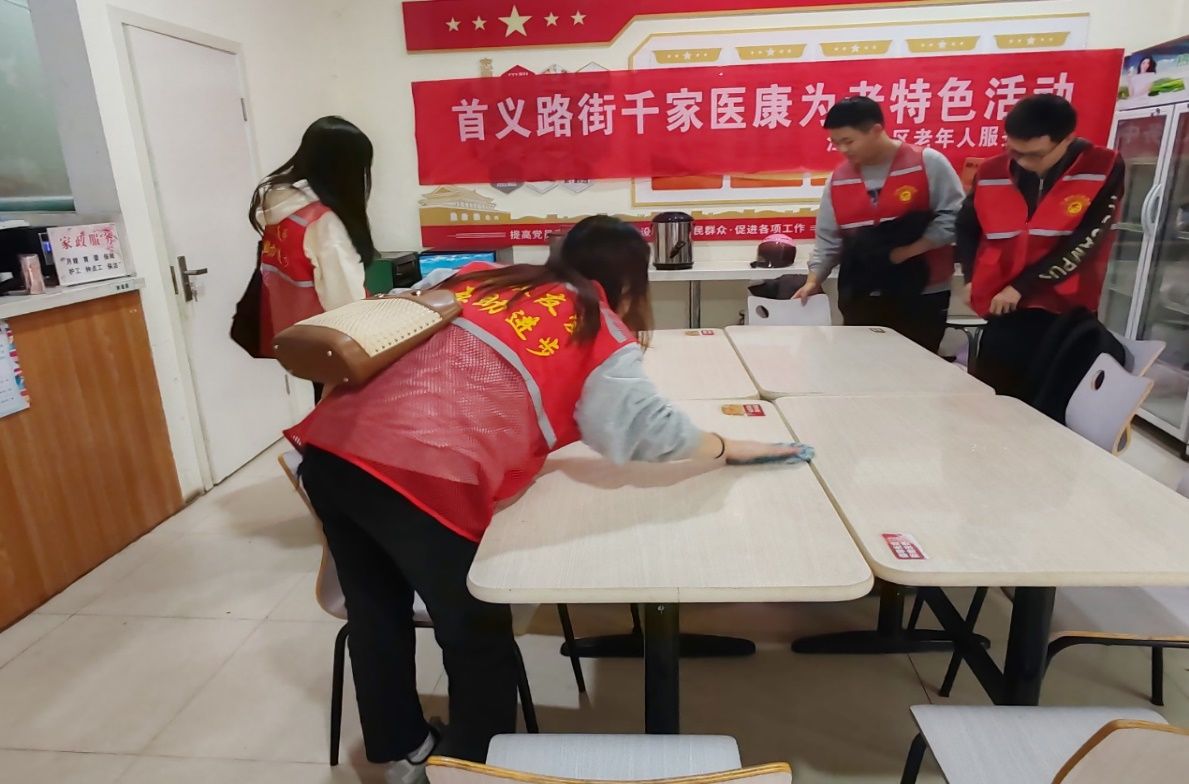 志愿者们首先来到社区食堂打扫卫生,手拿清洁工具全身心投入卫生工作之中,或擦拭厨柜,或打扫地面,或清理桌面,或整理服务窗口等。