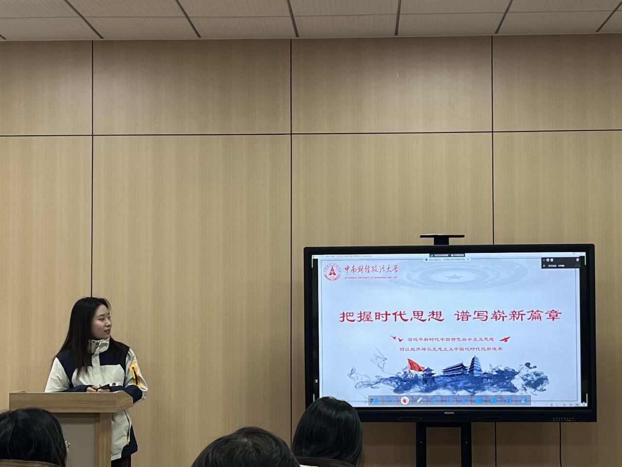 而后,由谭梦菲同志在实践行动方面就如何“开辟马克思主义中国化时代化新境界”进行讲解,主要从“为什么要讲好中国故事”、“讲好什么样的中国故事”、“怎样讲好中国故事”三个角度展开论述。