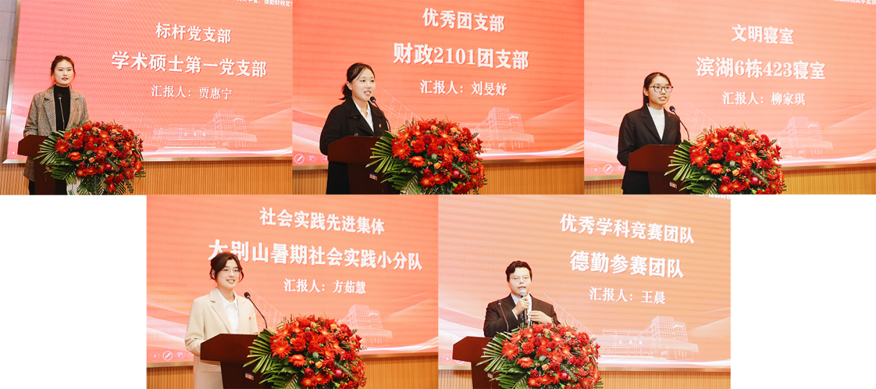 在展示环节中,获得“标杆党支部”荣誉的学术硕士第一党支部、获得“优秀团支部”荣誉的财政2101团支部、获得“文明寝室”荣誉的滨湖6栋423寝室、获得“社会实践先进集体”荣誉的大别山暑期社会实践小分队以及获得“优秀学科竞赛团队”的德勤参赛团队分别进行了汇报,展示了各自在支部建设、学术科研和社会实践方面的优秀表现。