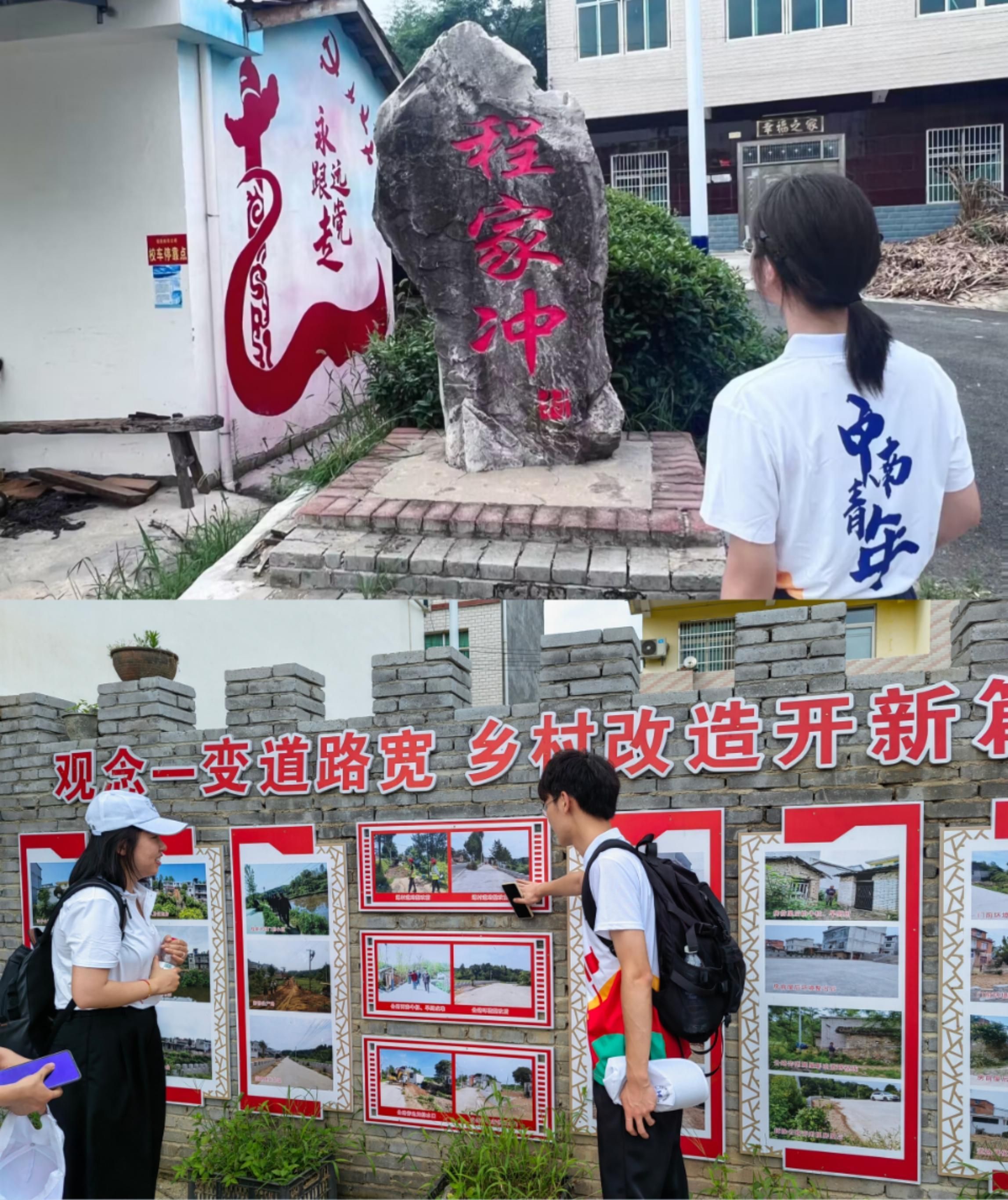 随后实践队参观了美丽乡村程家冲村和江树塆。队员们看到村里都铺上了平坦宽阔的柏油路,还有设有休闲健身器材的广场,村里干净整洁,环境优美。在程家冲村村中心的一面宣传墙上记录了该村近十年的变化过程,村支书郑书记感叹地说,美丽乡村建设离不开政府扶持和村民的参与,是共同努力的结果。在江树塆,实践队走访了村民江大叔。江大叔热情地告诉大家,乡村振兴战略实施后,整个江树塆的村容村貌发生了很大的改观:道路上的垃圾没有了,村里建起了干净的公厕,家家户户通上了自来水,家里种植花生、大米、芝麻等,粮补耕补都及时到位,村民安居乐业,心里更踏实了。如今的江树塆,更有合作社、村集体工厂、油茶产业等一项项民生工程,这一切带来了乡村持久兴旺的新希望。