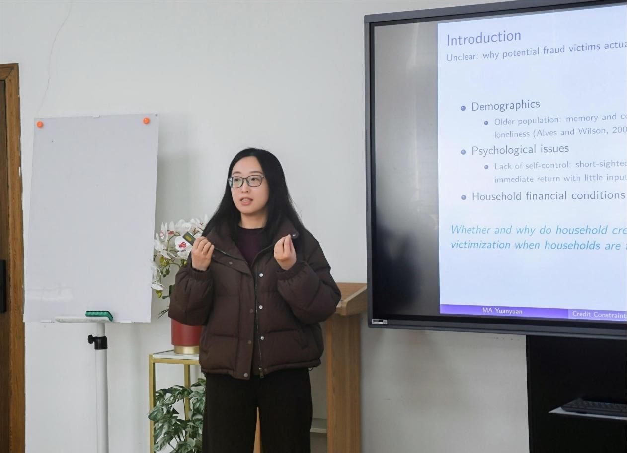 12月21日上午,“财”思泉涌·学术研讨会(第50期)在文泉楼北601会议室顺利举行。本次研讨会邀请到了财政税务学院马媛媛老师带来题为“Credit Constraints and Fraud Victimization:Evidence from a Representative Chinese Household Survey”的学术报告。会议由王筱筱老师主持,财政税务学院部分教师以及研究生共同参与。