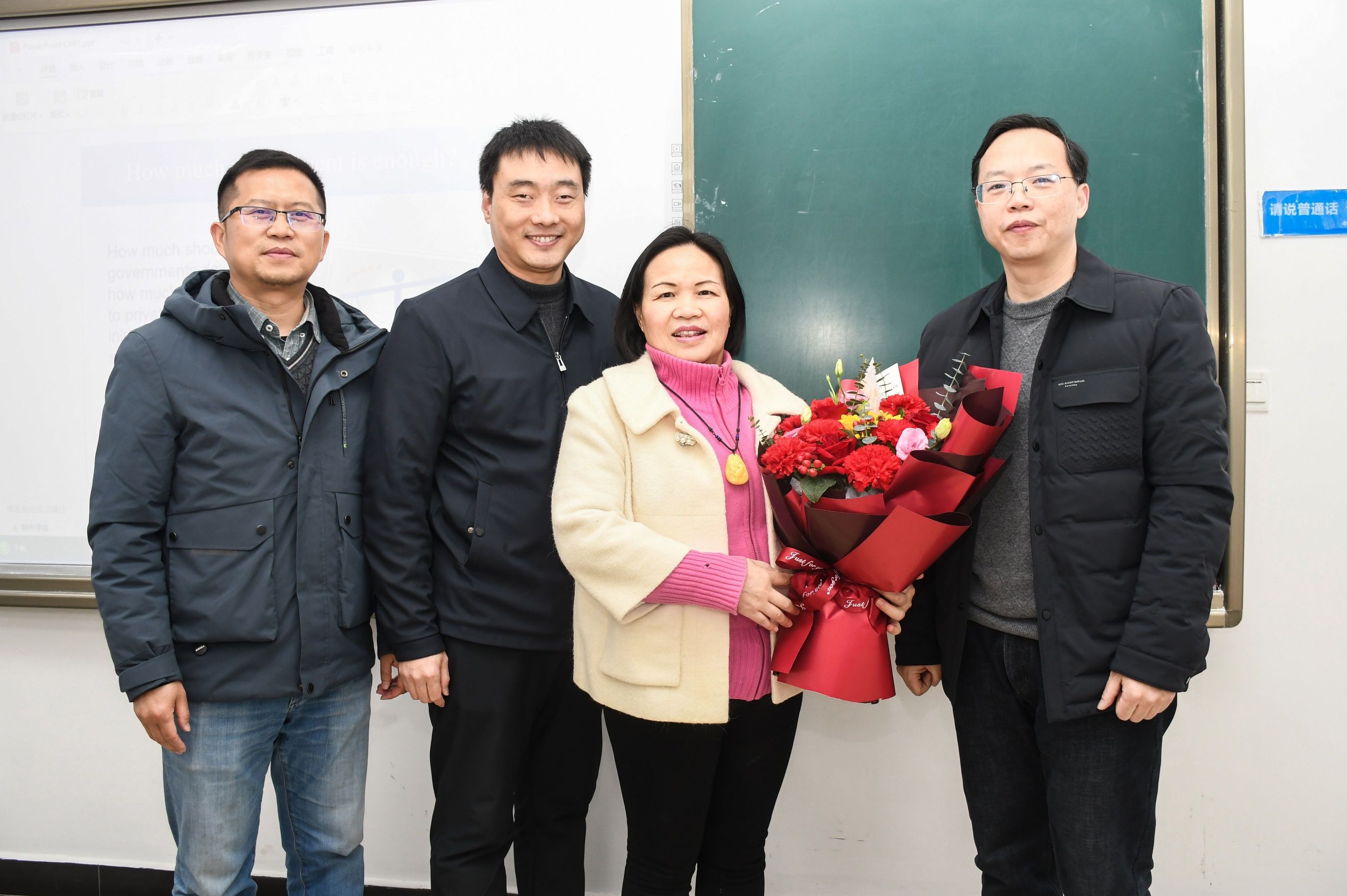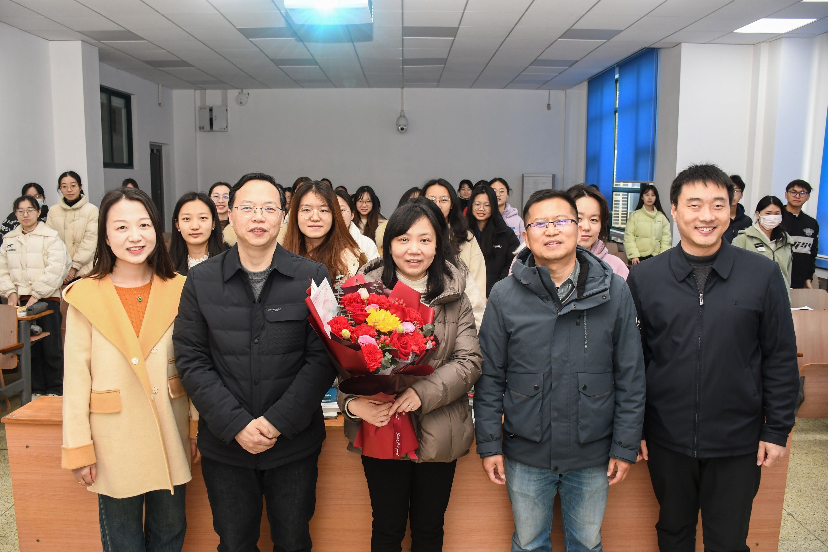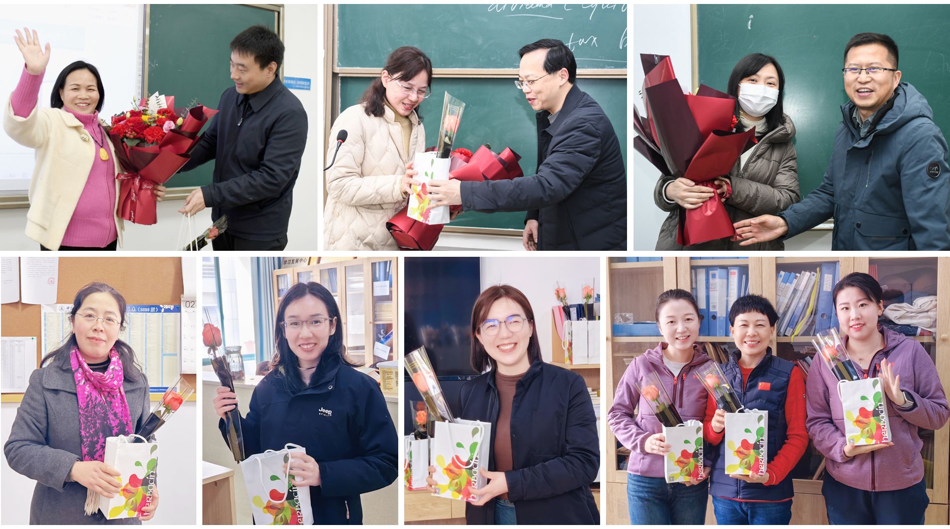 财政税务学院副院长薛刚、副院长魏福成、党委副书记吴兴华一行走进文泰楼教室,为学院节日当天仍坚守在教学一线的女教师们送上鲜花,感谢她们的辛勤奉献。学院工会也为每位女教职工精心准备了鲜花和礼物,向学院所有女教职工致以节日问候和美好祝愿。