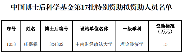 6月27日,中国博士后科学基金会对2024年度中国博士后科学基金第17批特别资助拟资助人员名单进行了公示。我院庄嘉霖老师获得特别资助,资助经费15万元。