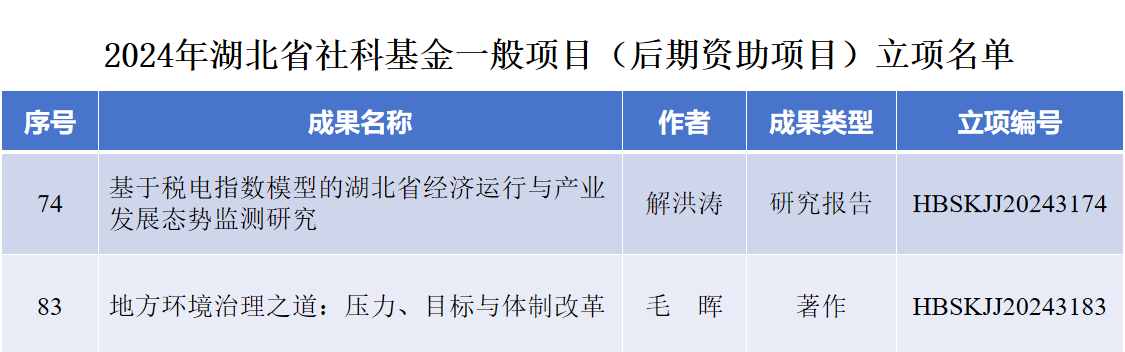 近日,湖北省社会科学界联合会发布了《关于2024年湖北省社科基金一般项目(后期资助项目)立项名单的公告》,财政税务学院解洪涛教授和毛晖教授分别获得立项资助。