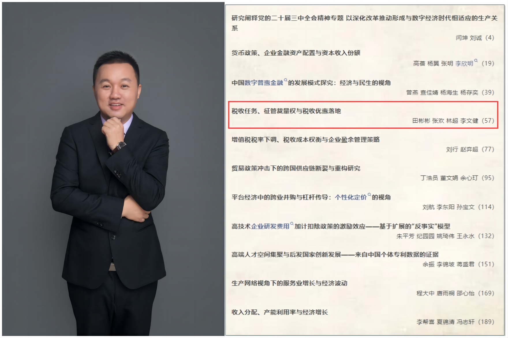 近日,我院田彬彬教授及其团队成员(张欢,财税学院博士生;林超,中国人民大学财政金融学院博士生;李文健,浙江大学经济学院研究员)合作完成的研究成果“税收任务、征管裁量权与税收优惠落地”在顶级期刊《经济研究》2024年第8期正式发表。