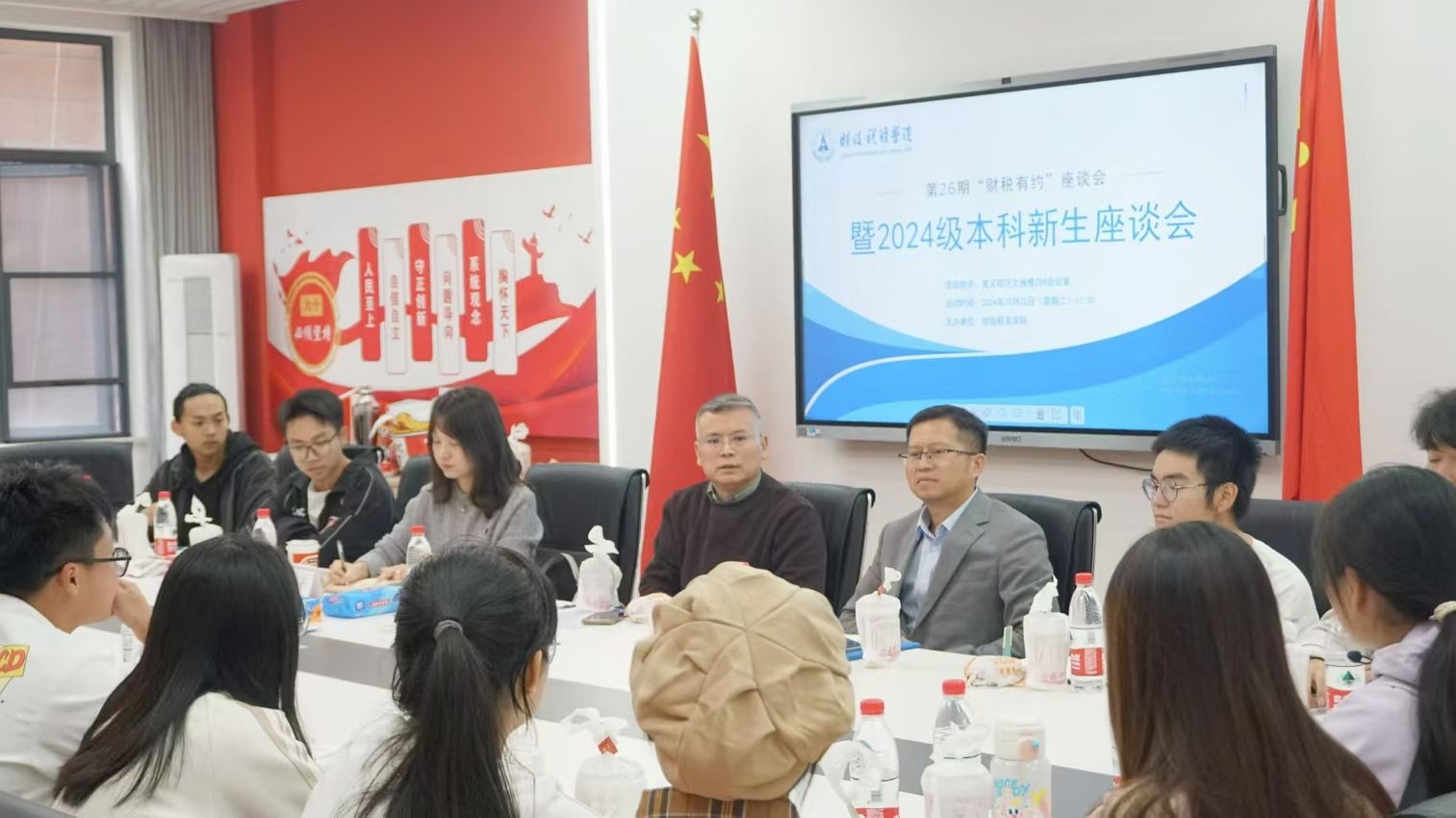 为帮助2024级新生更好适应大学生活,10月22日中午,财政税务学院于首义校区“一站式”学生社区204党团活动室举办第26期“财税有约”新生座谈会。财政税务学院院长张克中、副院长魏福成、2024级新生辅导员韩睿子以及2024级本科新生代表共同参加活动。会议由韩睿子老师主持。