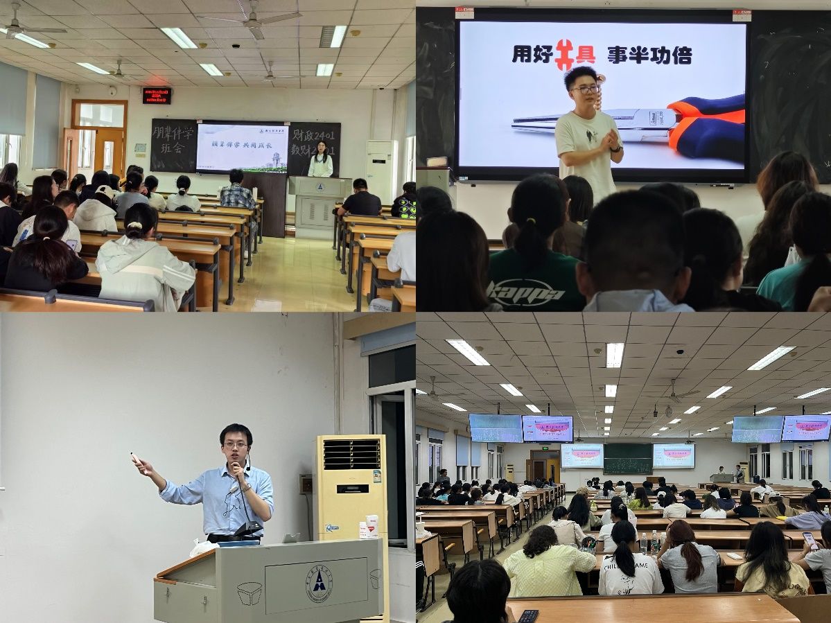 各班组织召开班会,分享经验,交流心得。邀请工商管理学院2024级农业管理专业硕士研究生包嵘臣,分享如何从高中思维转变为大学思维,更好适应大学生活;邀请财政税务学院2022级优秀本科生江俊澄师兄主讲《本科生科研入门指北》,为新生同学推开科研之门;财政2401班班助郭沈垲、数财2401班吕梵迪就课程学习、科研竞赛、学生工作、校园生活四个方面进行经验分享,答疑解惑。