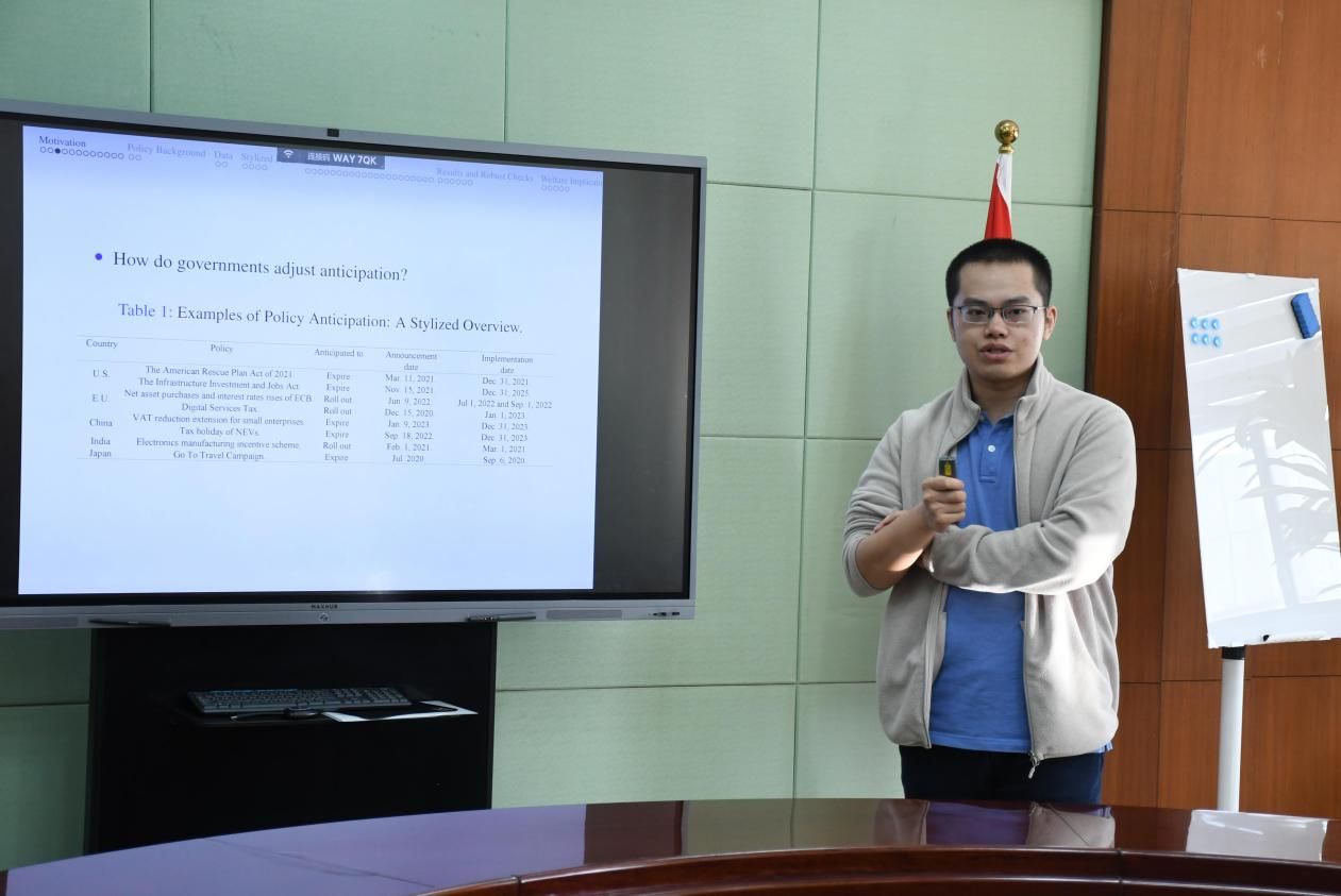 2024年11月27日下午,文澜财税论坛(第96期)在文泉楼北603会议室顺利举行。本次论坛邀请了清华大学经济管理学院李嘉晟老师作了题为“Managing Policy Anticipation”的学术报告。讲座由财政税务学院欧阳洁老师主持,学院部分教师及研究生共同参与了本次学术交流活动。