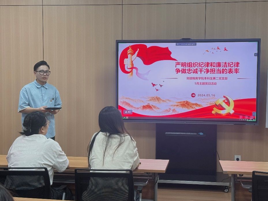 为深入学习贯彻习近平总书记重要讲话精神,巩固深化主题教育成果,增强党的纪律建设的自觉性和坚定性,财政税务学院本科生第二党支部于2024年5月16日在文泉楼北503会议室开展主题为“严明组织纪律和廉洁纪律,争做忠诚干净担当的表率”主题党日活动。会议由宋宜宸同志主持,支部全体成员参加了本次活动。