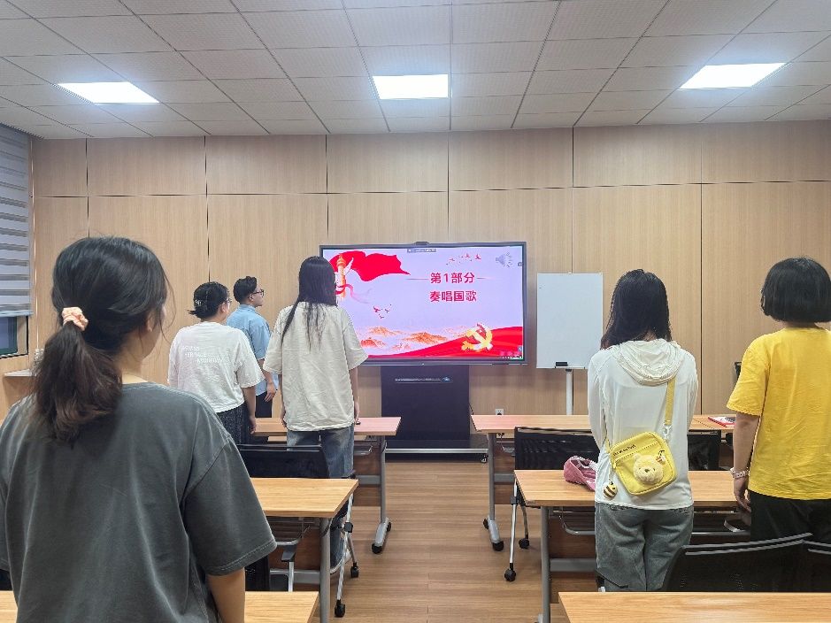 会议第二项,支部成员全体起立,面向党旗举起右拳,由宋宜宸同志领读,重温入党誓词。