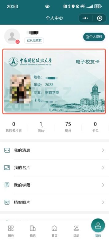 1.完成身份认证后,点击右下角“我的”一栏,点击“米兰电竞·(中国区)电子校友卡!”立即领取。