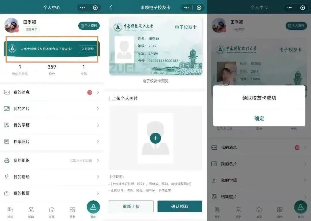 若未申领电子校友卡,可先在“中南大智慧校友服务平台”小程序完成身份认证以及校友卡的领取,再预约返校。
