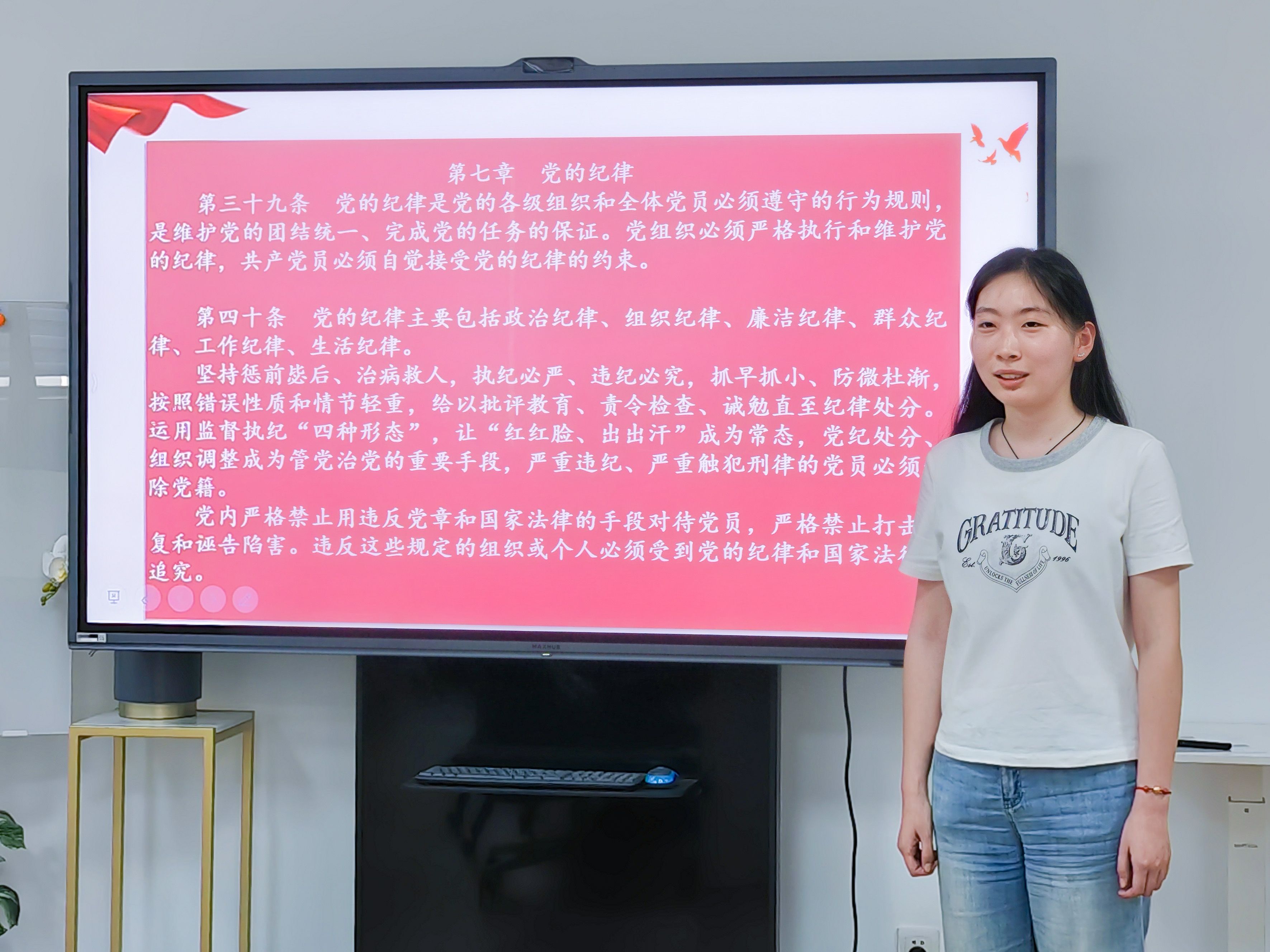活动伊始,冯佳琪同志带领全体党员重温入党誓词,并领学《中国共产党章程》第七章“党的纪律”,全体党员现场交纳党费。