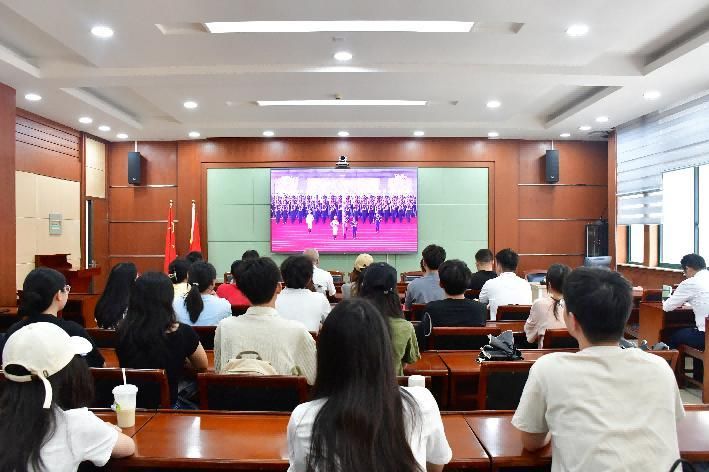 学院领导班子成员同师生代表在文泉北楼403会议室组织师生代表集中收看纪念中国人民抗日战争暨世界反法西斯战争胜利80周年大会直播。广大学院师生在工作间、宿舍自行收看直播。