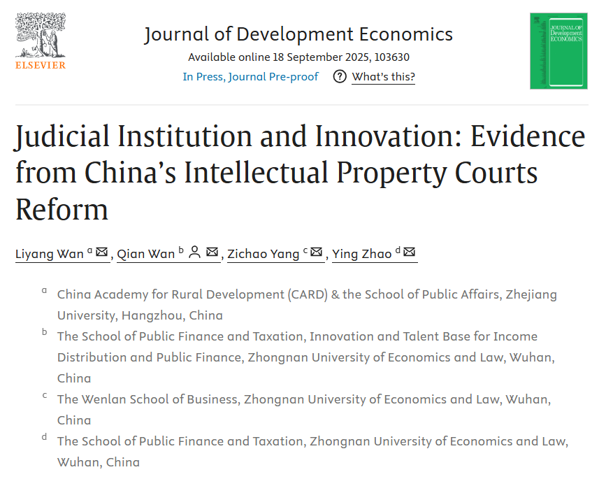 近日,米兰电竞·(中国区)财政税务学院万千老师、赵颖教授及其合作者完成的论文 “Judicial Institution and Innovation: Evidence from China’s Intellectual Property Courts Reform”在发展经济学领域顶级期刊Journal of Development Economics上在线发表。该文从创作到发表全程在财政税务学院完成,这是学院“国际化、强特色、创一流”的学科建设之路上产出的又一重大标志性成果。