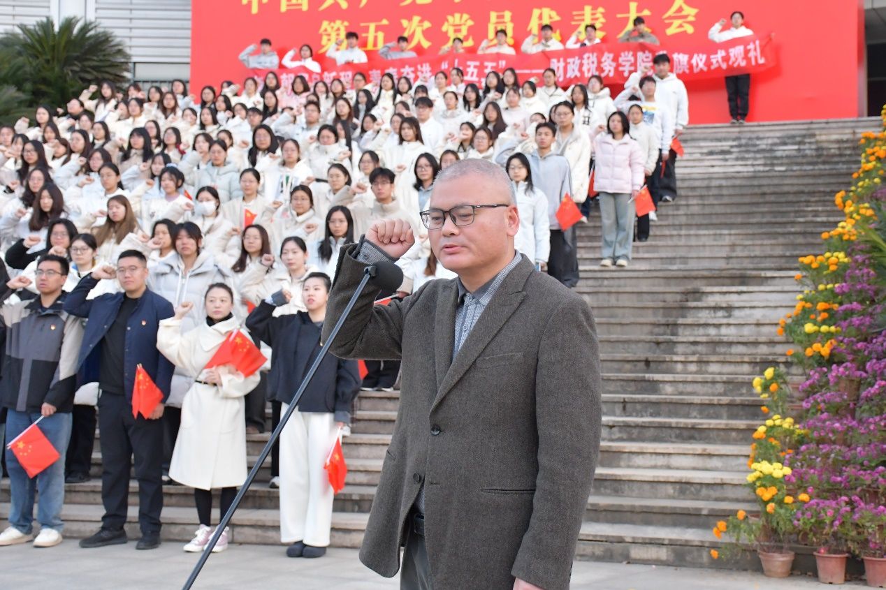 为深入学习贯彻党的方针政策,厚植青年学子家国情怀与法治信仰,凝聚奋进“十五五”的青春力量,财政税务学院于12月1日上午成功举办以“旗展朝阳启新程,青春奋进‘十五五’”为主题的国旗故事会活动。党委研究生工作部部长张文剑,党委学生工作部副部长赵晓,财政税务学院党委书记徐警武、院长鲁元平、副院长魏福成、党委副书记杨少同及学院行政教辅老师、学生党员、入党积极分子代表共同参与此次活动。活动由税收2403班周宇傲同学主持。