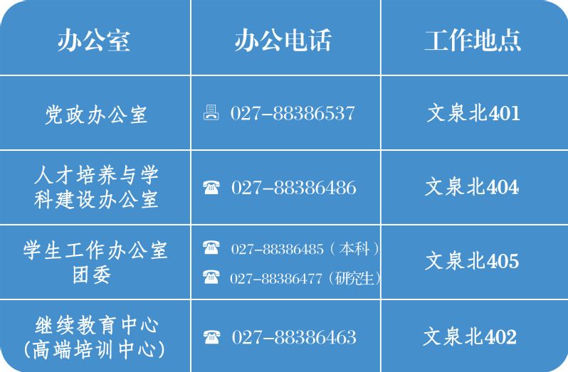 学生工作办公室 ☎︎ 027-88386485(本科生) ☎︎ 027-88386477(研究生)