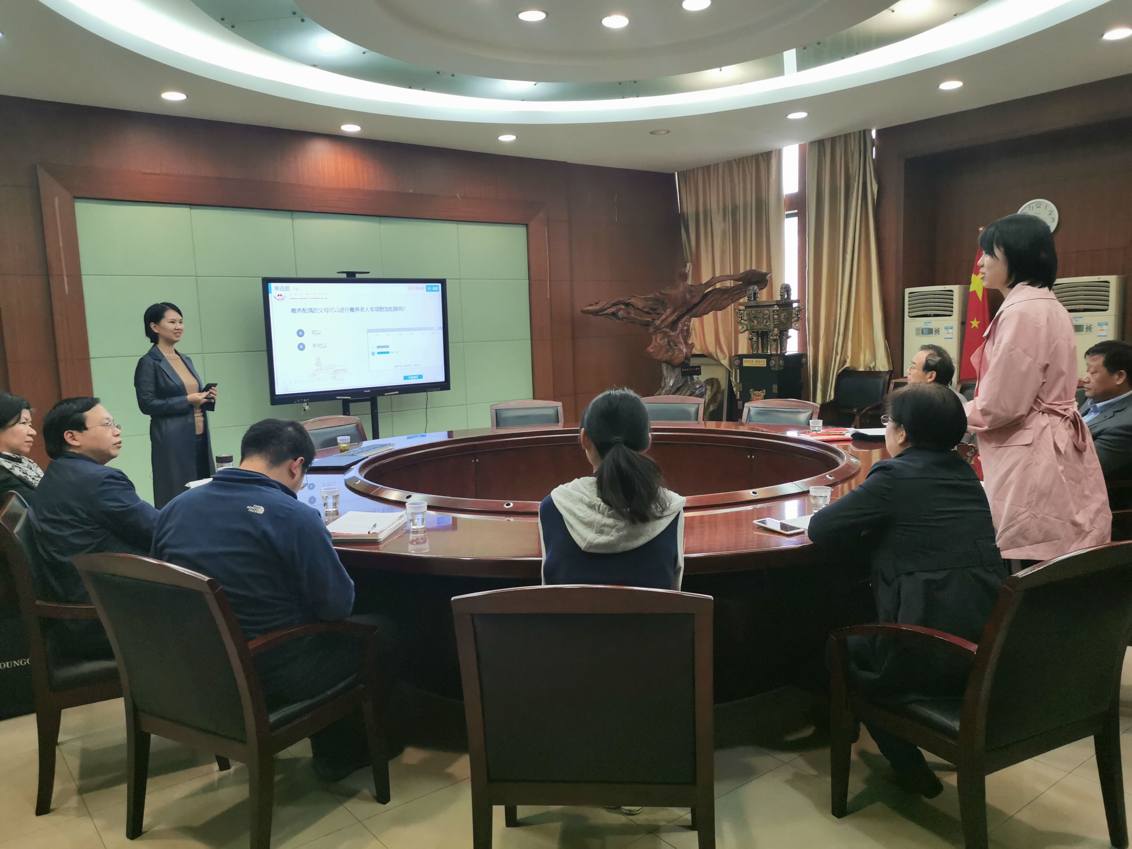 倪娟老师以《中国税制》课程中的个人所得税-专项附加扣除为主要内容,分别从子女教育、继续教育、大病医疗、住房贷款利息、赡养老人专项附加扣除等几个方面详细讲述了课程知识,整个讲课过程逻辑清晰,精神饱满,表达流畅,难易适度,并熟练使用“雨课堂”新媒体技术手段与学生进行互动。讲课结束后,各位评委老师充分肯定了倪娟老师的讲课优点,并从课程内容、语气语调、课件制作、案例引入等多方面提出改进建议,同时分享交流了授课经验和技巧方法。