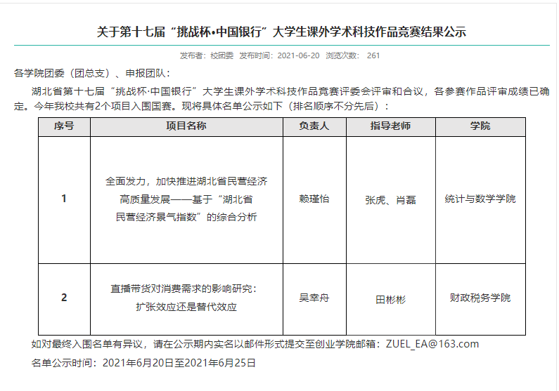 近日,由团省委、省科协、省教育厅、省学联主办的湖北省第十三届“挑战杯·中国银行”大学生课外学术科技作品竞赛在中南民族大学落下帷幕。经过前期多轮的专家评审以及现场答辩,由我院田彬彬教授指导的团队项目《直播带货对消费需求的影响研究:扩张效应还是替代效应?》(团队成员:吴幸舟、杨婉云、丁婉睿、吴亚丁、郑嘉梁)荣获省一等奖,并获得了代表学校参加全国大赛的资格。据悉,此次获奖是我院近年来在“挑战杯”系列赛事中获得的最好成绩,反映了学院在人才培养,尤其是强化本科生班级导师制方面的最新成果。