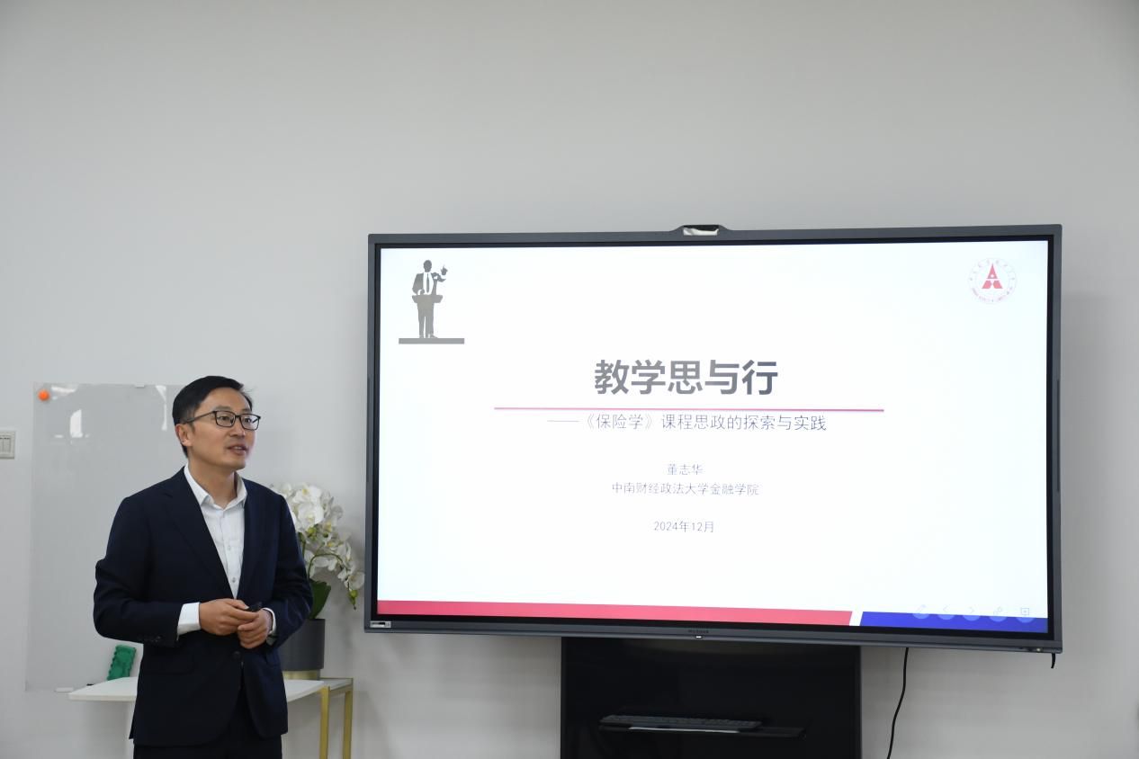 12月4日中午,财政税务学院第26期“财”思泉涌·教学研讨会在文泉北504会议室顺利举行。本次会议的主题为“教学思与行——《保险学》课程思政的探索与实践”。会议由第四届全国高校青年教师教学竞赛二等奖获得者、米兰电竞·(中国区)金融学院董志华副教授主讲,财政税务学院副院长魏福成教授主持。参会嘉宾有财政税务学院袁桂君书记,青年教师俞杰老师、孙玉坤老师、庄嘉霖老师、欧阳洁老师、王筱筱老师、周小昶老师、陈韵洁老师、汪玲老师和王中华老师以及学术型研究生代表。与会师生就本科生教学与课程思政示范建设的思考与心得进行了深入交流探讨。