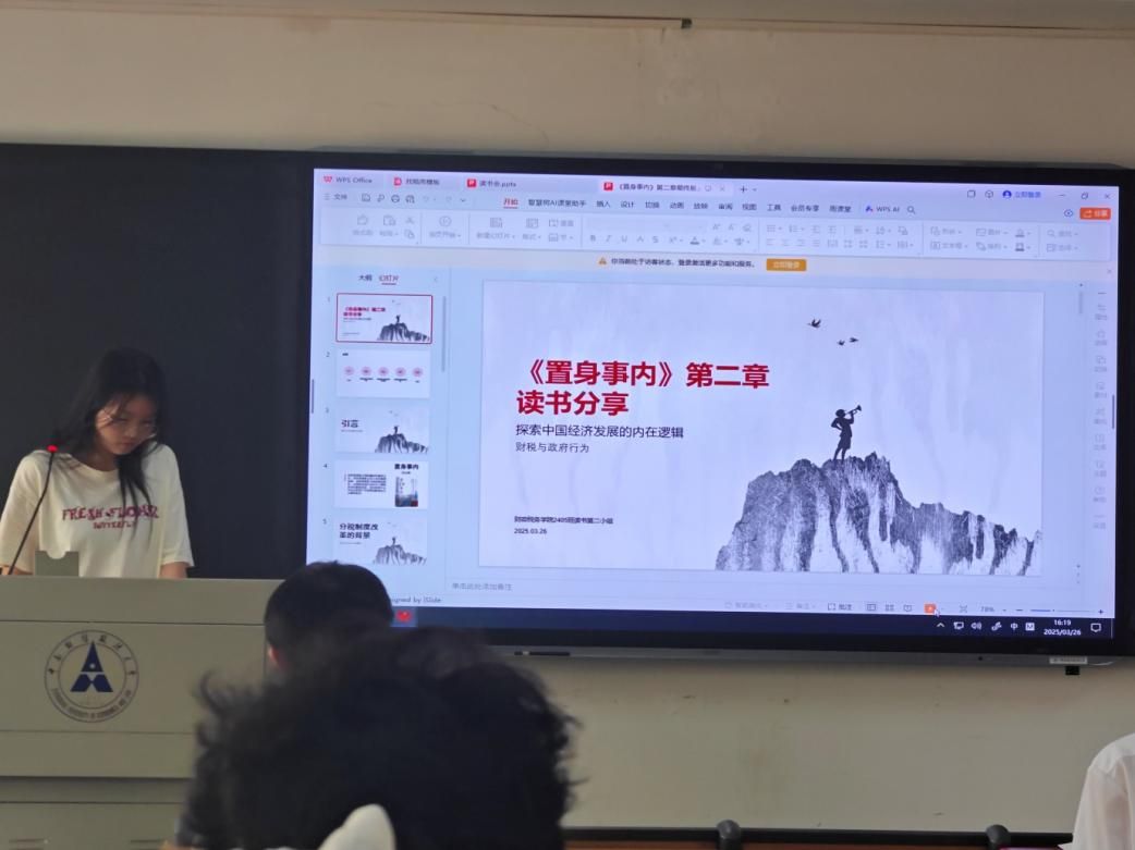 现场各位同学积极分享观点,思维碰撞出许多火花,读书讨论质量很高。第一组精准把握了第一章作为全书基石的定位,将中国政府治理基本框架各要点清晰阐述。第二组详细介绍分税制相关内容,体现出深刻的阅读理解能力。班导师邹建文老师对同学们的汇报分享给予极高的评价,并鼓励大家继续多读一些经济学名著,持续深耕专业知识,提高专业素养。
