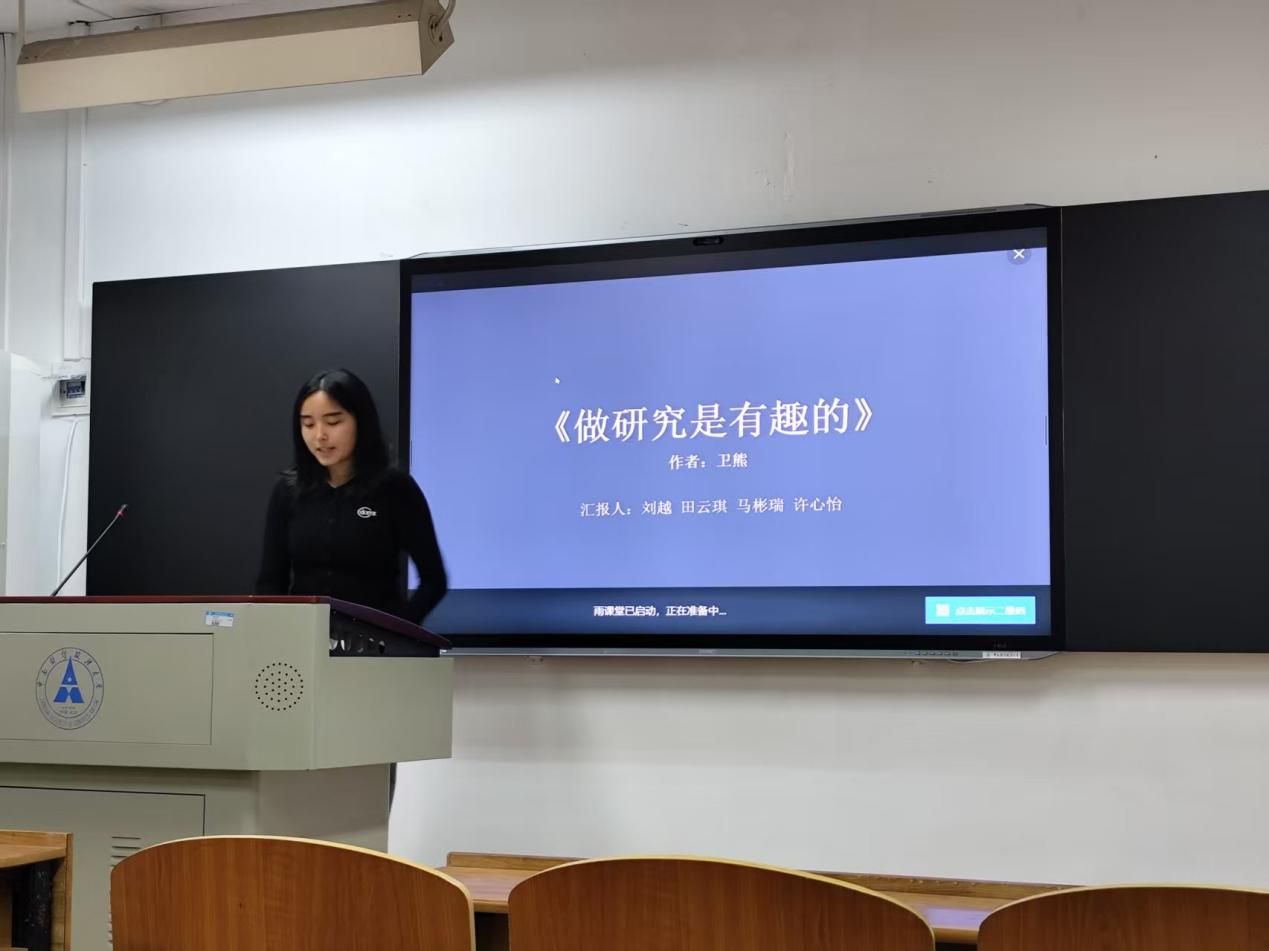 刘越、田云琪、马彬瑞和许心怡等同学组成的小组,以《做研究是有趣的》为切入点,从学术研究的底层逻辑出发,结合小组实践案例,揭秘如何将枯燥的文献阅读转化为充满创造力的探索过程。同学们的分享内容涵盖“问题发现—研究设计—成果表达”全链条,为在场同学提供了实用方法论。大家认识到,“研究不是苦行,而是用好奇心点亮未知领域的火炬。”