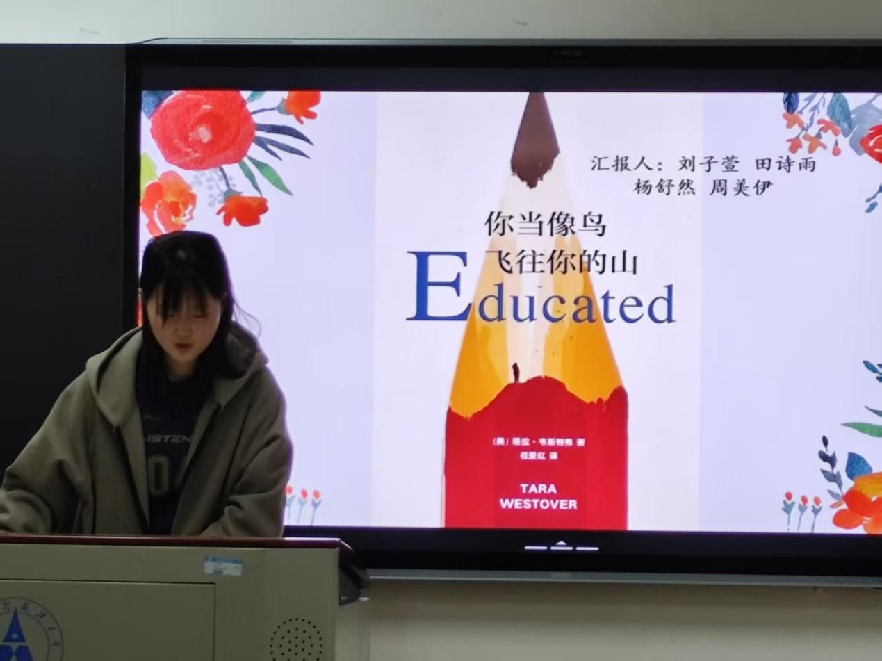 刘子萱、田诗雨、杨舒然和周美伊等同学组成的小组,通过《你当像鸟飞往你的山》的共读,剖析主人公在原生家庭与自我教育间的挣扎与蜕变,引发对“教育本质”“个体超越困境的可能性”的探讨。现场还穿插真实案例阐释,映射书中主题。